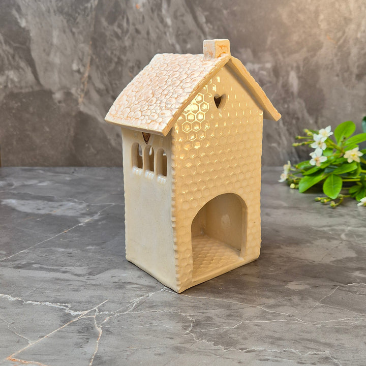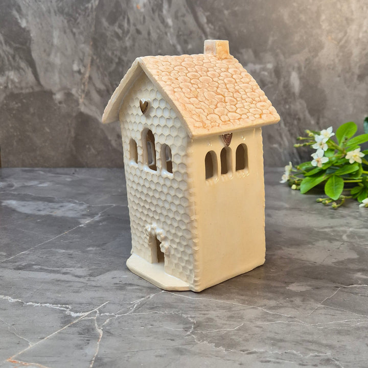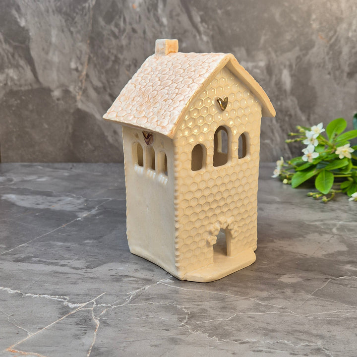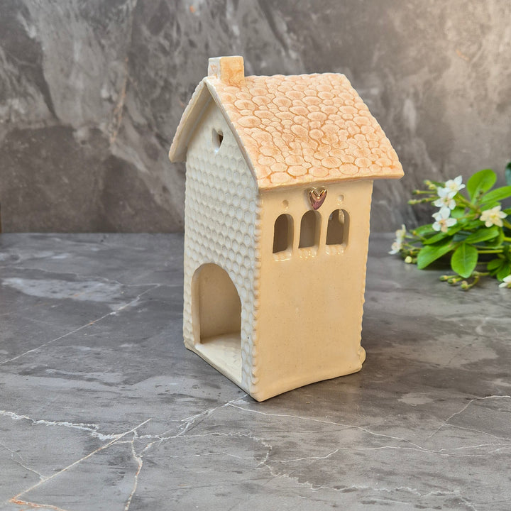 Hand built Ceramic Tealight Homes. Welcome to the Far Forest — a magical little village where every house glows with charm. These hand built ceramic houses are designed to hold a battery-operated tealight, casting a warm flicker through tiny windows and doors. Each one is completely unique, with its own details, texture, and personality.