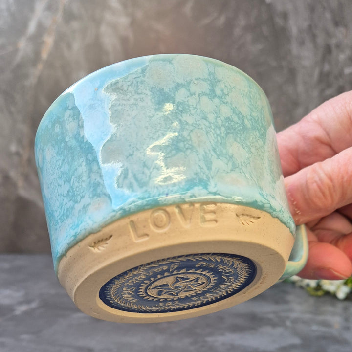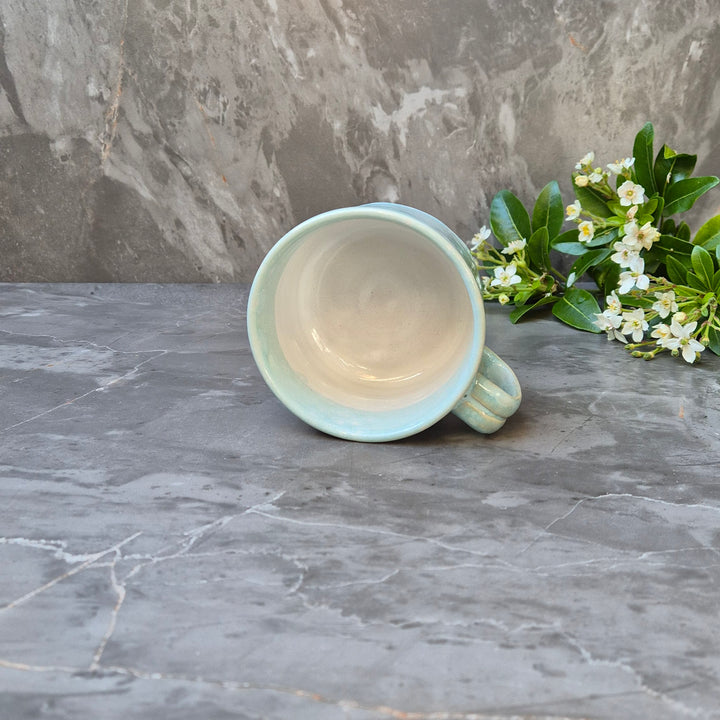 Beautiful handmade Hot Chocolate, Candy Cane, Marshmallow, Mug made from white Stoneware clay from the Celadon Bloom collection.