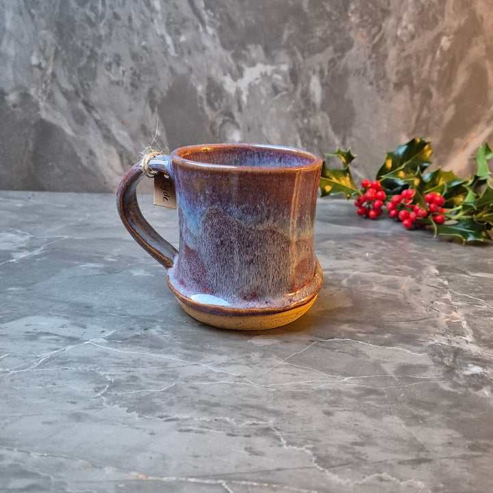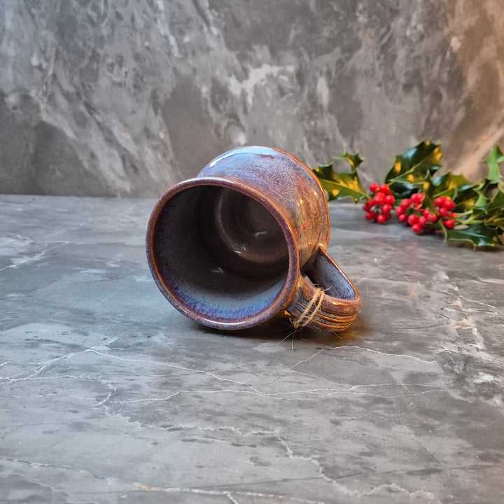 Once the form is complete, the mug is dried slowly for a week under plastic. It is then bisque-fired to 1000°C before glazing, which involves several hand-brushed layers to achieve depth and richness. A final glaze firing to 1220°C completes the piece. From start to finish, each mug takes around 3–4 weeks to create.