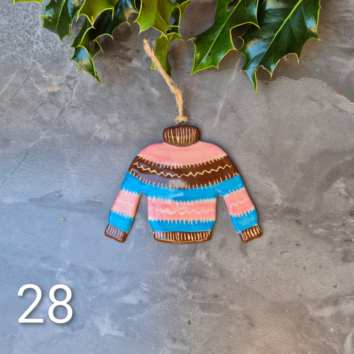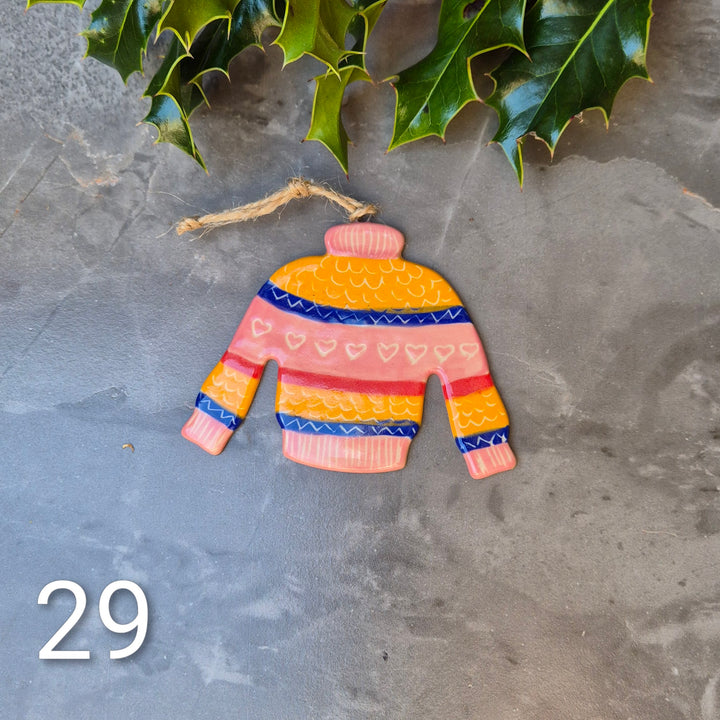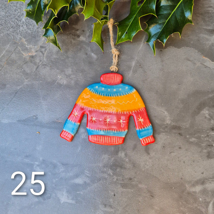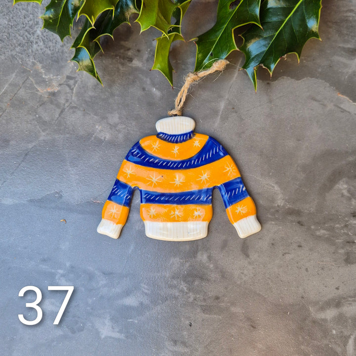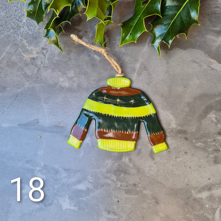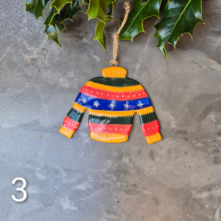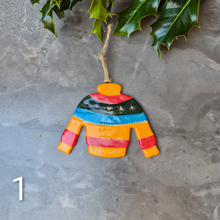 Celebrate the delightfully over-the-top tradition of the ugly jumper — with a hand made twist. These ceramic ornaments are shaped like classic jumpers and individually hand-painted and hand-carved using the sgraffito technique, revealing colourful, festive patterns beneath the surface. Each one is a little work of art, full of character, texture, and holiday cheer.